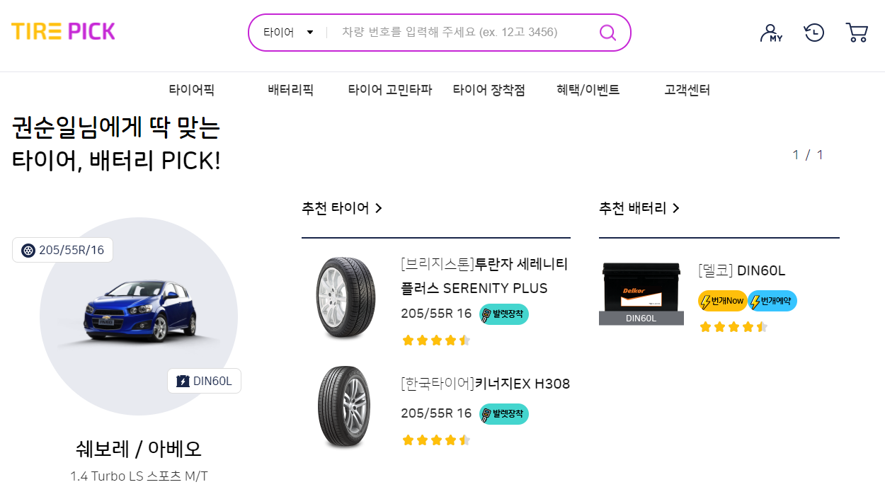 내 차의 순정타이어 종류와 배터리를 바로 확인할 수 있어요.